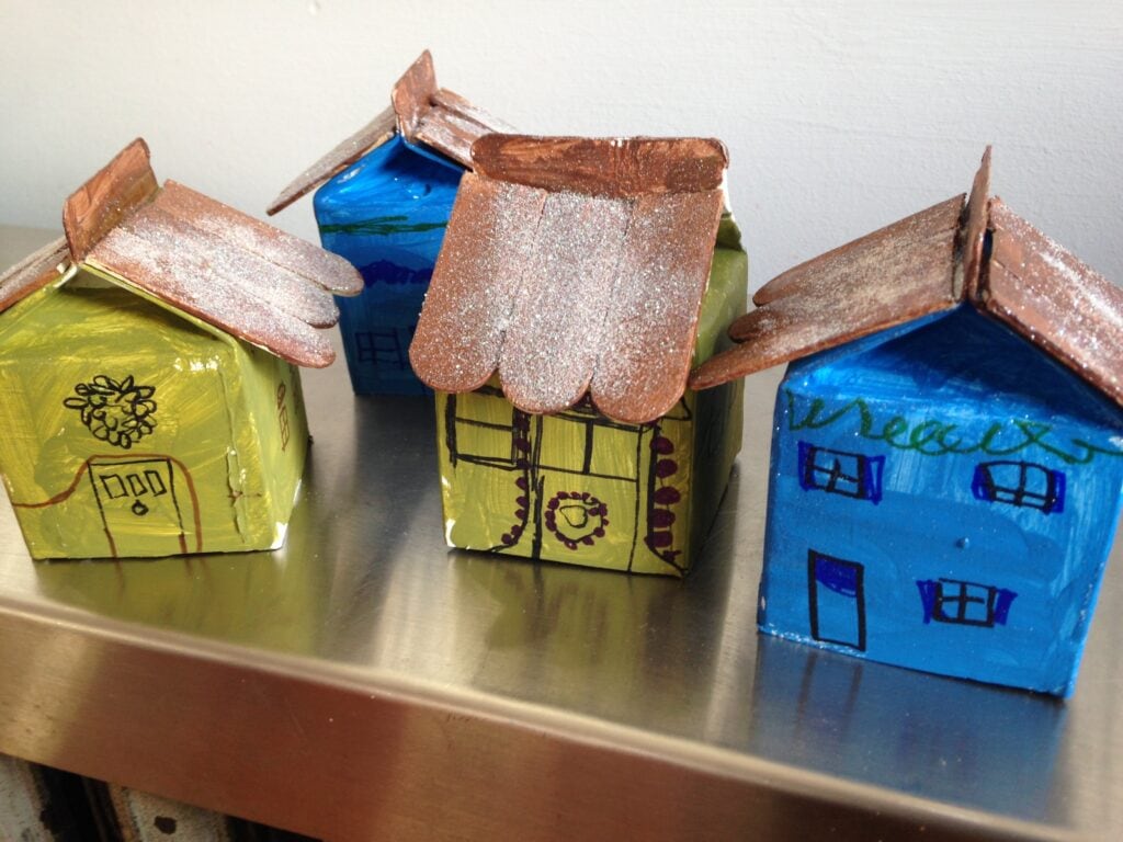 We used empty milk cartons (ask at your child’s school fro a few empty ones – or purchase a few, smaller cartons in anticipation of this activity) and washed them out thoroughly. Once dry, we painted them first with a white primer and then once, dry, painted with another final coat of color. We used a sharpie marker on the dry houses to do some details.