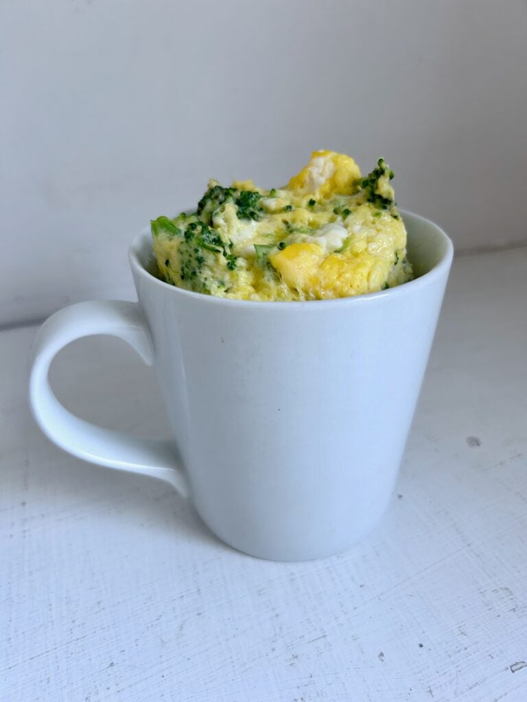 Simple put 3 eggs, a pat of butter and about a 1/3 cup cheese or veggies into a large, microwave-safe mug and stir to blend. Cook on high for one minute, then stir and cook for one more minute, stir again and cook for an additional 30 to 60 seconds.