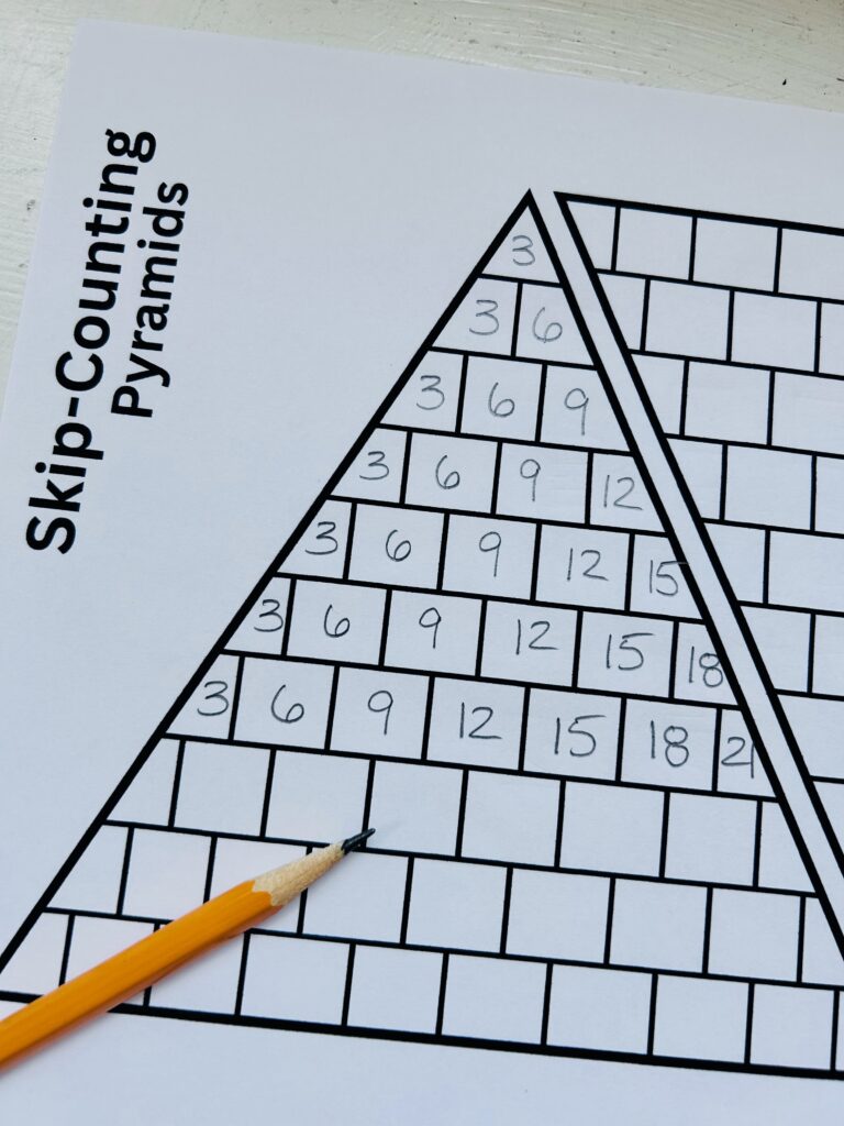 Skip-Counting Pyramids are a fun way to practice multiplication….Kids can cut out the pyramids from this free download . Place a number, 2 thru 10 at the very top. Skip count, adding one more number to the sequence, as you work your way down the pyramid.